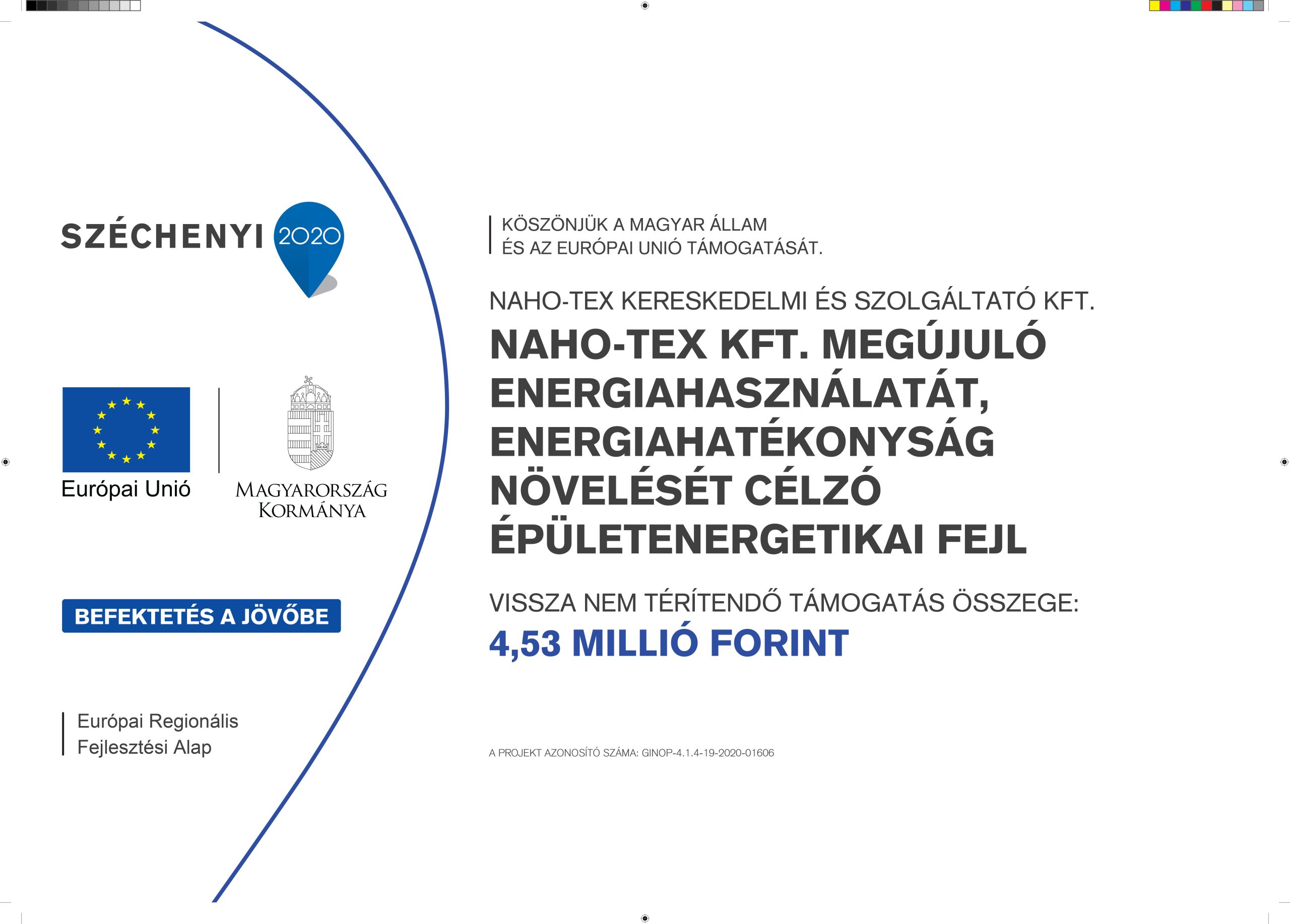A NAHO-TEX Kft. 4,526 millió forint európai uniós támogatást nyert a Széchenyi 2020 program keretében meghirdetett „Kiskapacitású, saját villamosenergia-fogyasztás kiváltását célzó napelemes rendszer telepítésének támogatása mikro-, kis- és középvállalkozásoknak” tárgyú felhíváson.